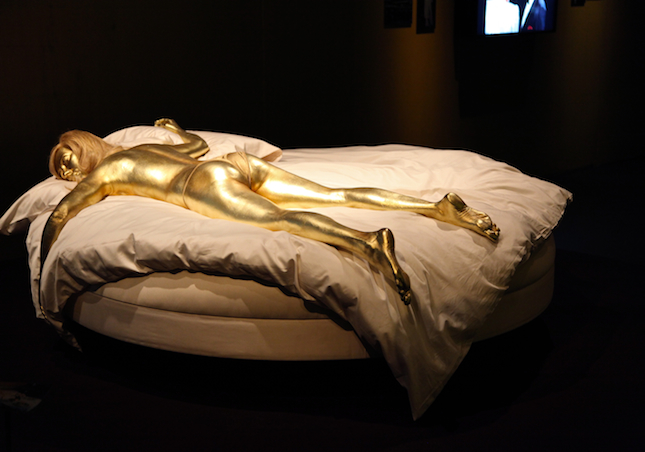 Created for the exhibition, a lifesize waxwork of one of cinema's most enduring images, Shirley Eaton as Jill Masterson murdered by a coating of gold.