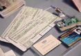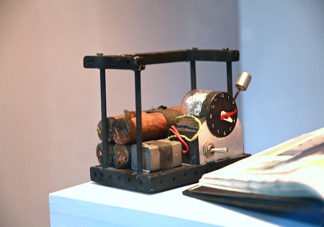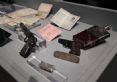 Bond's gadget stash, including laser firing Polaroid, alarm clock bomb and cigarette packet detonator.